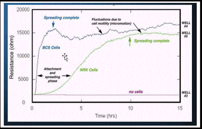 ECIS技術(shù)的重要應(yīng)用之一是研究細(xì)胞伸展貼壁行為。這種測量方法可以研究細(xì)胞與細(xì)胞外基質(zhì)的相互作用對(duì)細(xì)胞貼壁能力的作用。這種方法是實(shí)時(shí)的和定量地,和傳統(tǒng)的終點(diǎn)法相比有著顯著的優(yōu)勢(shì)。